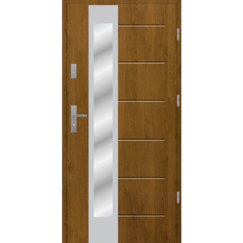 Die Tür ist mit einem Haupt- und Oberschloss ausgestattet. Der Flügel ist an drei verstellbaren Scharnieren aufgehängt, die eine Einstellung in zwei Achsen ermöglichen. Der Rahmen besteht aus profiliertem Blech, das auf das Flügeldesign abgestimmt ist, und ist mit einer Edelstahlschwelle versehen. Die doppelte Dichtung an Flügel und Rahmen sorgt für perfekte Isolierung.